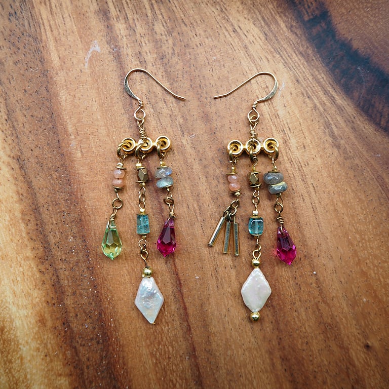 Cocktail of gemstones (sunstone, labradorite, aquamarine, pearl), glassbeads and Swarovski crystals